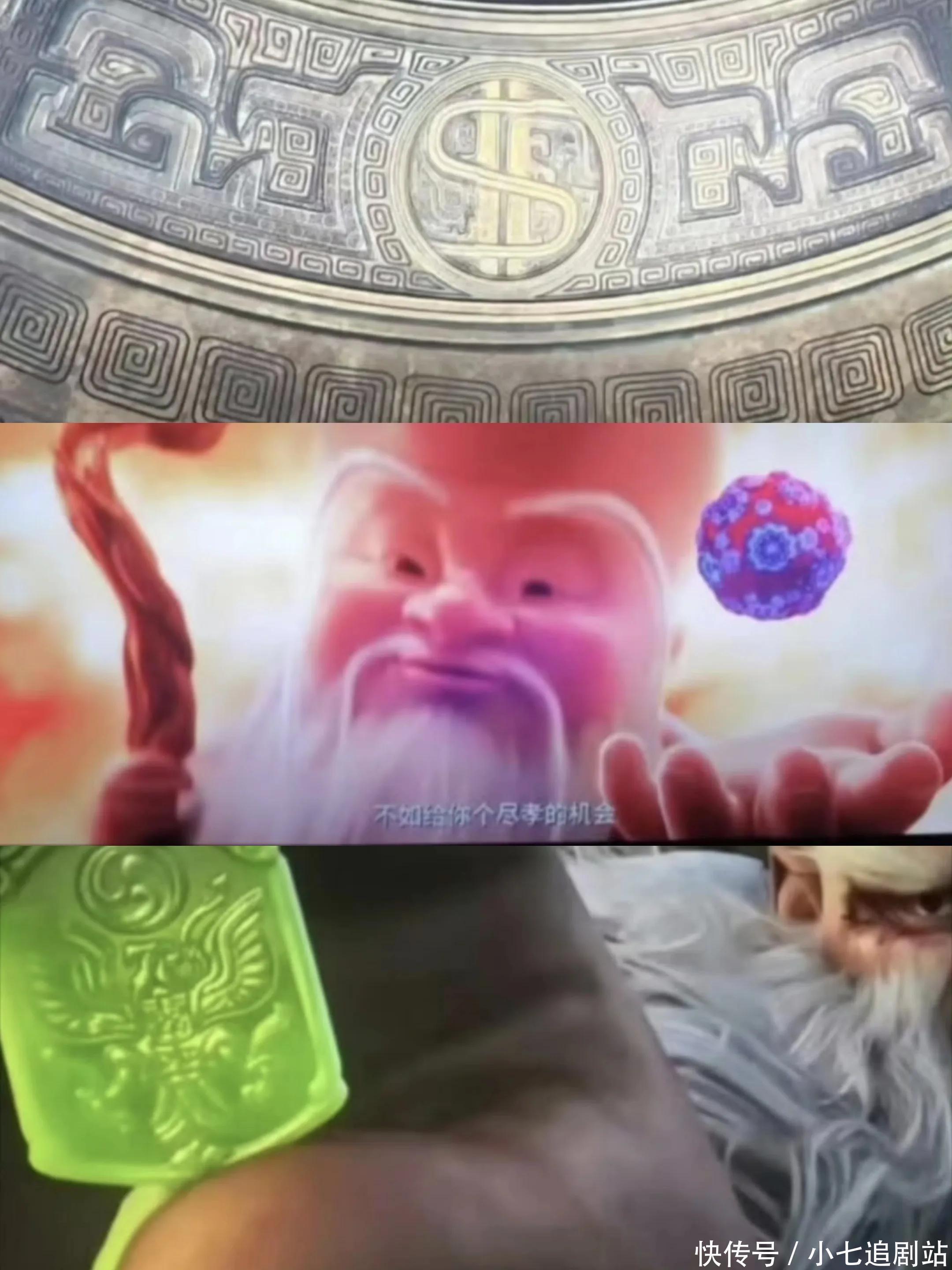 要是这些都不够明显,讲解不了什么,那么无量仙翁给哪吒的妙药,那表情像不像病毒?巧的是真金不怕火丹炉上还有好意思元记号。